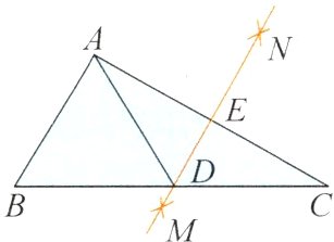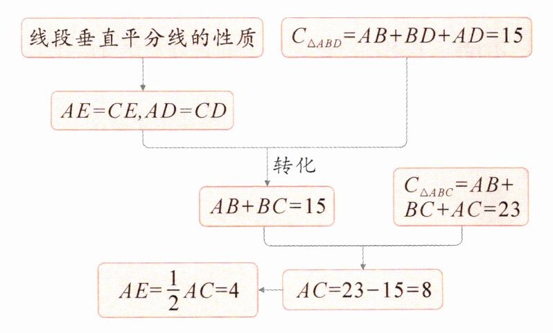 例4 (整体思想)如图,在△ABC中,分别以点A,C为圆心,以大于$\frac{1}{2}$AC的长为半径作弧,两弧相交于点M,N,连接MN分别交AC,BC于E,D两点。若△ABC的周长为23,△ABD的周长为15,则AE的长是________。