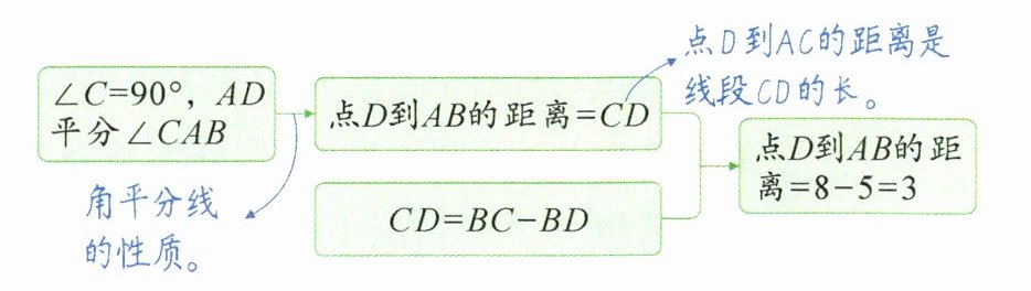 例1 [教材P133随堂练习T1变式题][太原期末]在Rt△ABC中,∠C = 90°,AD平分∠CAB交BC于点D。若BC = 8,BD = 5,则点D到AB的距离为( )
