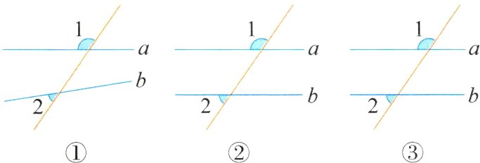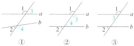 (3)如图③,已知∠1 + ∠2 = 180°,试说明直线a//b,并用文字叙述由此你能得出的结论。
