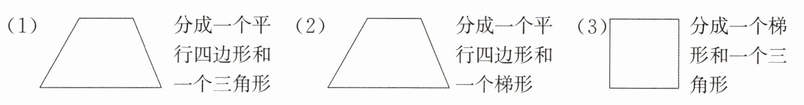 (2)画一条与左边腰或右边腰平行,且不经过上面顶点的平行线,即可将原图分成一个平行四边形和一个梯形。