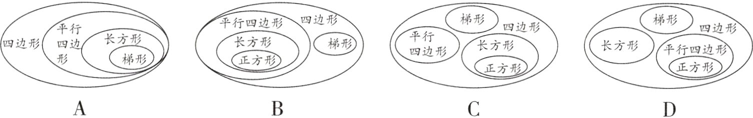 B 解析:梯形是特殊的四边形,平行四边形是特殊的四边形,长方形和正方形是特殊的平行四边形,正方形是特殊的长方形,据此可知,B图是正确的。