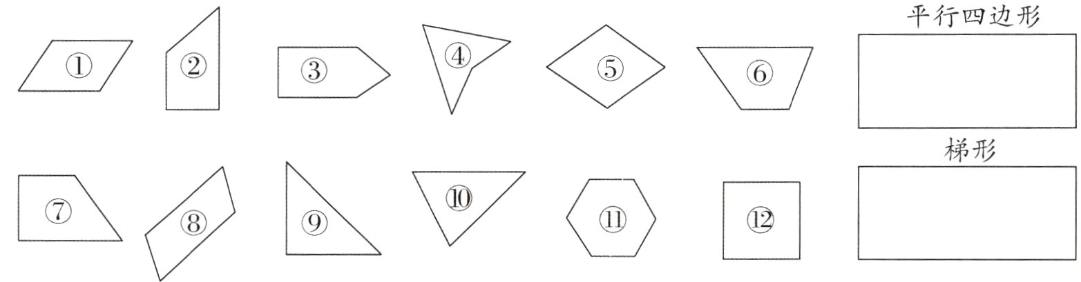 5. 在下面的图形中,平行四边形有( )个,梯形有( )个。