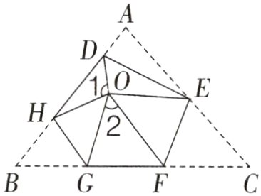 5. 如果,将三角形ABC的三个角分别沿DE、HG、EF翻折,三个顶点均落在点O处。根据三角形ABC的内角和求出$\angle1 + \angle2$的度数。(5分)