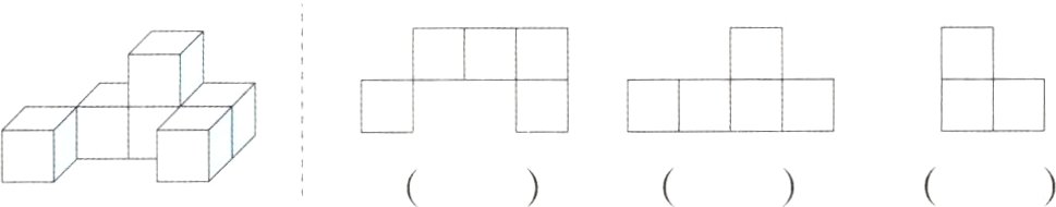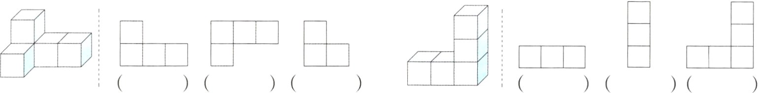 解析:第1个立体图形从正面看,下面是3个横向排列的正方形,最左边的正方形上面还有1个正方形;从上面看,上面是3个横向排列的正方形,最左边的正方形下面还有1个正方形;从左面看,下面是2个横向排列的正方形,左边的正方形上面还有1个正方形。第2个立体图形从正面看,下面是3个横向排列的正方形,最右边的正方形上面还有2个正方形,呈纵向排列;从上面看,是3个横向排列的正方形;从左面看,是3个纵向排列的正方形。第3个立体图形从正面看,下面是2个横向排列的正方形,左边的上面还有1个正方形;从上面看,是2个横向排列的正方形;从左面看,是2个纵向排列的正方形。第4个立体图形从正面看,下面是4个横向排列的正方形,左数第3个正方形上面还有1个正方形;从上面看,上面是3个横向排列的正方形,最左边的正方形左下方有1个正方形,最右边的正方形下面还有1个正方形;从左面看,下面是2个横向排列的正方形,左边的正方形上面还有1个正方形。