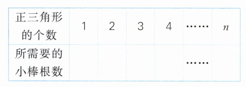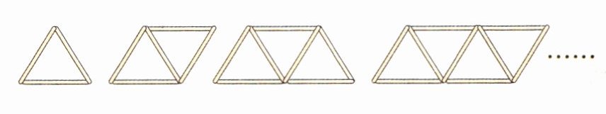 4. 如图所示,摆一个正三角形需要3根小棒,摆2个正三角形需要几根小棒?摆3个、4个……n个呢?