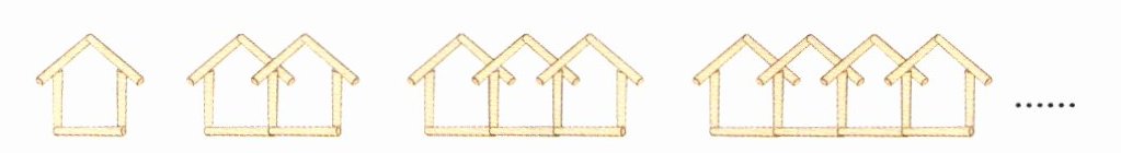 解析:(1)搭1间房子需要5根小棒,以后每多搭一间需要增加4根小棒,所以搭$n$间房子需要$(4n + 1)$根小棒。(2)根据“搭$n$间房子需要$(4n + 1)$根小棒”可知,$4n + 1 = 101$,$n = 25$,也就是101根小棒可以搭25间房子。