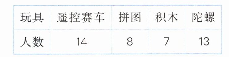 2. [陕西省汉中市略阳县期末]某玩具厂为了弄清哪一种玩具最受欢迎,以确定今后一段时间的主要生产品种,于是进行了调查。下面是调查了育才小学四(2)班全体学生最喜欢的玩具后做的记录表。