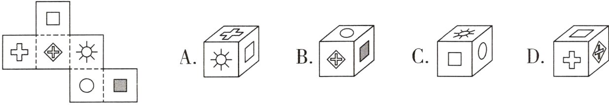 (2)D 解析:此展开图属于正方体展开图的“1 - 3 - 2”型,根据围成正方体后,六个图案的相对位置,即可做出选择。