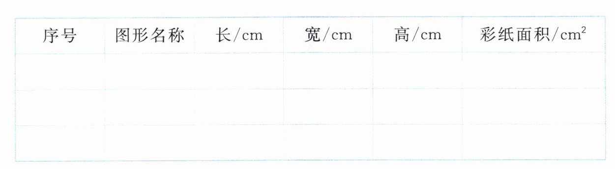1. 三种不同长度的小棒分别有12根(15 cm)、8根(10 cm)、4根(8 cm),请你搭出3种不同的长方体或正方体,若给该立体图形各面都贴上彩纸,至少需要多少平方厘米的彩纸?完成下表。