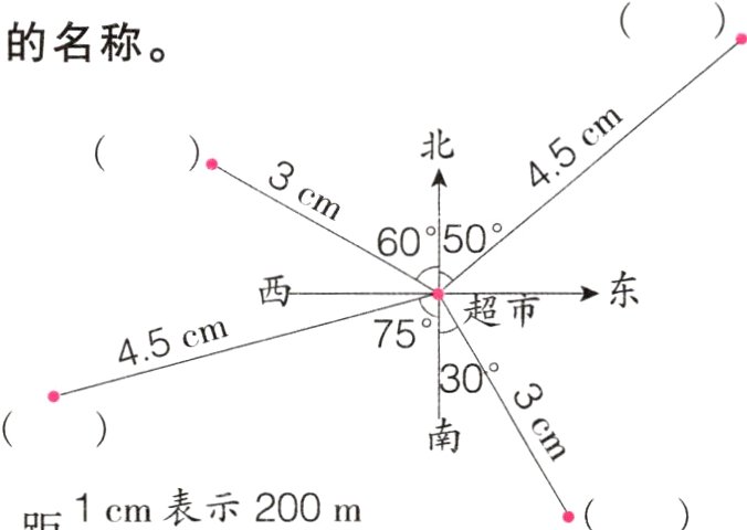 (3)超市的位置是( )偏( )( )°方向,距离街心花园( )m。