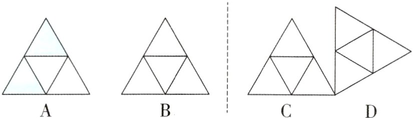 4. 按下列作图步骤,依次在图形B、C、D中涂上阴影:将图形A平移得到图形B;将图形B沿图中虚线翻折得到图形C;将图形C沿其右下方的顶点顺时针旋转90°得到图形D。