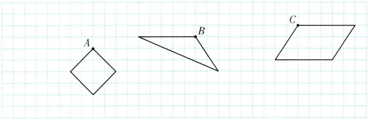 (1)根据旋转的特征,三角形绕点A顺时针旋转90°,点A的位置不动,其余各部分均绕此点按相同方向旋转相同的度数,即可画出旋转后的图形。同理可画出梯形和平行四边形旋转后的图形。