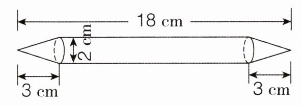 解析:这个组合图形是由两个完全一样的圆锥和一个圆柱组合而成,圆锥的高是3 cm,底面直径是2 cm,利用圆锥的体积公式“$V=\frac{1}{3}\pi r^{2}h$”,代入求出两个圆锥的体积,圆柱的高是(18 - 3 - 3)cm,底面直径是2 cm,再利用圆柱的体积公式“$V=\pi r^{2}h$”,求出圆柱的体积,最后把两个圆锥的体积和圆柱的体积加起来,即可求出组合图形的体积。