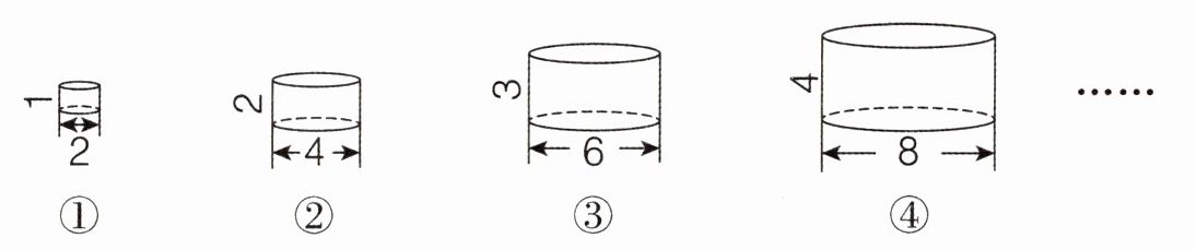 5. 观察下面的圆柱,分析它们的底面直径和高的变化引起体积变化的规律,根据这个规律,用含有字母的式子表示第n个圆柱的体积是( )。