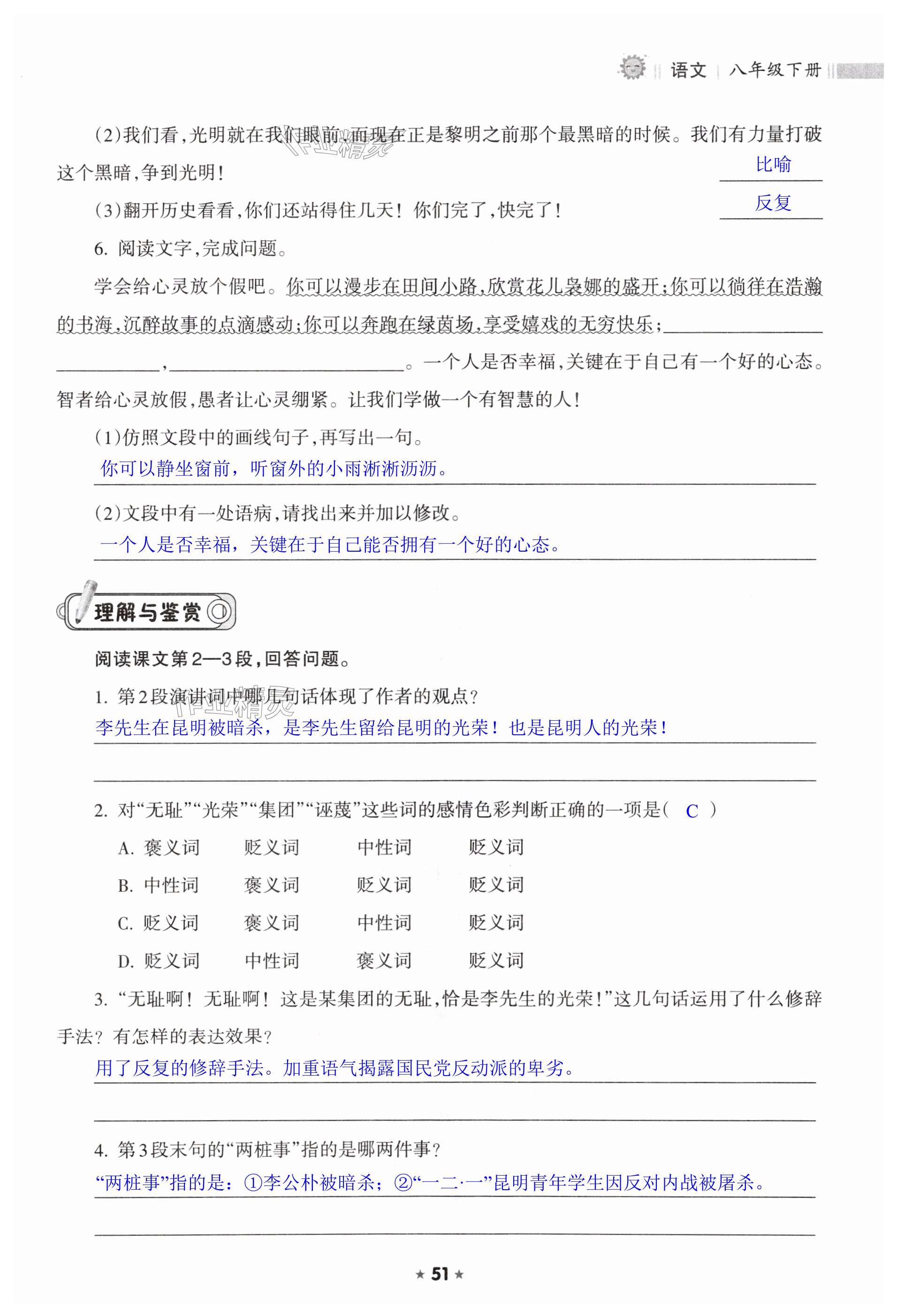 注:目前有些书本章节名称可能整理的还不是很完善,但都是按照顺序排列的,请同学们按照顺序仔细查找。练习册 2025年新课程课堂同步练习册八年级语文下册人教版 答案主要是用来给同学们做完题方便对答案用的,请勿直接抄袭。