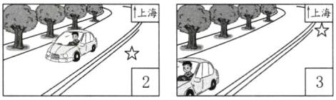 4.(生活体验)在公路上,一辆轿车正开往上海,下面三幅图是公路摄像头拍到的,已经按时间顺序编号,在后面两幅图中用“☆”画出红色轿车的大致位置。