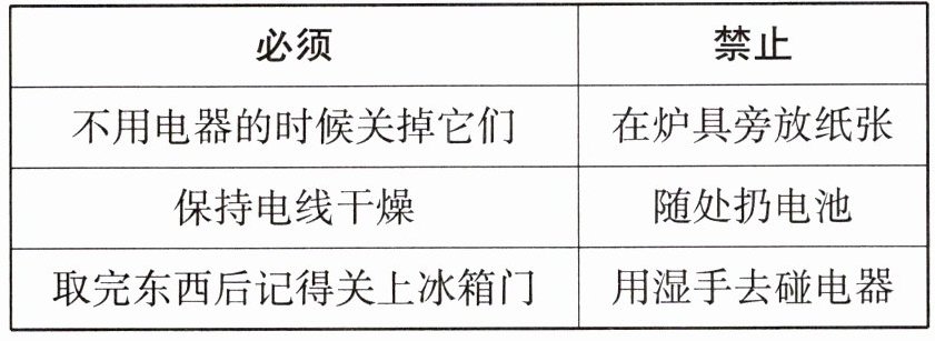 假设你是李明,你们家很注意节约用电,并且很关注用电安全常识。经过和家人讨论,你们制定了一套有关用电安全的家规。请根据下面表格中的要点提示,写一篇不少于70词的短文介绍一下该家规。