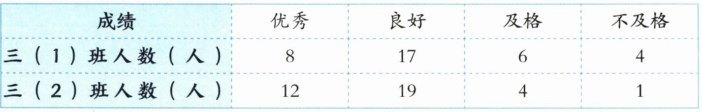 3.三年级学生1分仰卧起坐做42个及以上为优秀,做36~41个为良好,做16~35个为及格,做15个及以下为不及格。下面是三年级两个班学生1 分仰卧起坐成绩统计表。