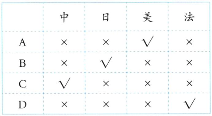 A是美国人;B是日本人;C是中国人;D是法国人。