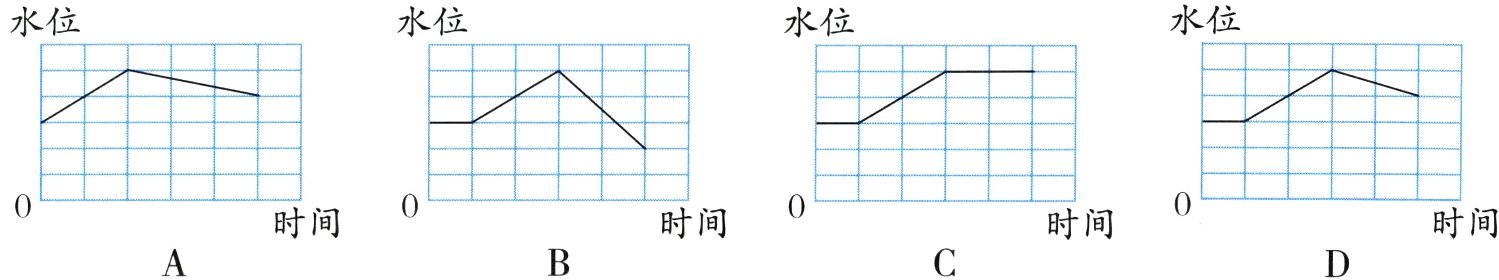 4. 跨学科·语文 乌鸦喝水的故事是这样的:一只乌鸦看到一个水位较低的瓶子,喝不着水,深思一会儿后,聪明的乌鸦衔来一个个小石子放入瓶子中,水位上升后,乌鸦喝到了水。从乌鸦看到瓶子开始计时,下面符合故事情节的折线统计图是( )。