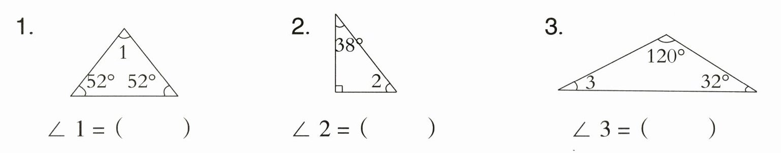 三、计算下列三角形中未知角的度数。 (每小题3分,共9分)