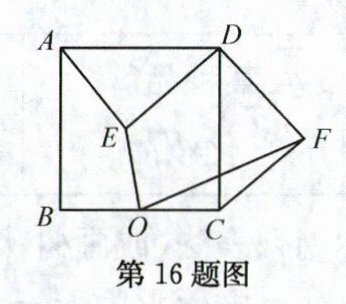 16. 如图,正方形$ABCD$中,$AB = 4$,$O$是$BC$边的中点,点$E$是正方形内一动点,$OE = 2$,连接$DE$,将线段$DE$绕点$D$逆时针旋转$90^{\circ}$得$DF$,连接$AE$,$CF$.则线段$OF$长的最小值为______.