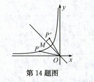 14. 如图,点$P$是反比例函数$y=\frac{k}{x}(x\lt0)$图象上的动点,点$P$绕着定点$O(0,0)$顺时针旋转$45^{\circ}$得到一个新的点$P'$,过点$P'$作二、四象限角平分线的垂线,垂足为点$M$,若$\triangle OMP'$的面积是$\frac{1}{2}$,则$k$的值为______.