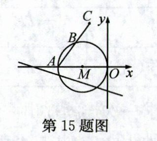 15. 如图,点$A$的坐标是$(a,0)(a\lt0)$,点$B$是以$OA$为直径的$\odot M$上一动点,点$A$关于点$B$的对称点为点$C$.当点$B$在$\odot M$上运动时,所有这样的点$C$组成的图形与直线$y = -\frac{3}{4}x - 3$有且只有一个公共点,则$a$的值等于______.