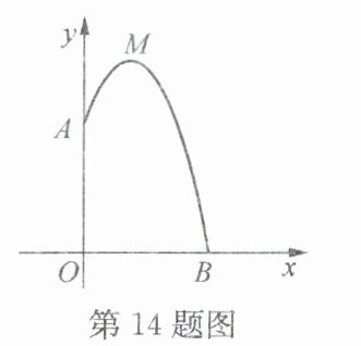 14. 某幢建筑物,从10米高的窗口A用水管向外喷水,喷出的水流呈抛物线状(抛物线所在平面与墙面垂直,如图所示),如果抛物线的最高点M离墙1米,离地面12米,则水流落地点B离墙的距离OB是______米.