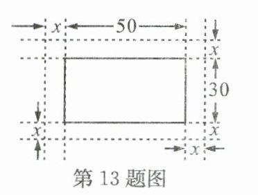 13. 如图,在一幅长50 cm,宽30 cm的矩形风景画的四周镶一条金色纸边,制成一幅矩形挂画,设整个挂画总面积为$y\ cm^{2}$,金色纸边的宽为x cm,则y与x的函数关系式是______.