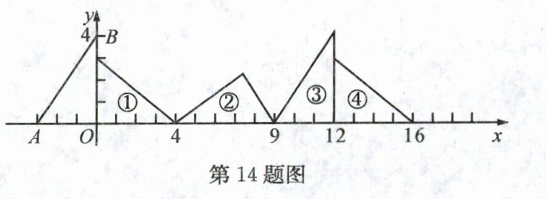 14. 如图,在直角坐标系中,已知点A(- 3,0),B(0,4),对△OAB作连续旋转变换,依次得到三角形①②③④…,则三角形⑩的直角顶点与坐标原点的距离为______.