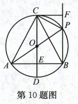 10. 如图,在⊙O中,直径CD垂直弦AB于点E,且OE=DE.点P为$\overset{\frown}{BC}$上一点(点P不与点B,C重合),连接AP,BP,CP,AC,BC,过点C作CF⊥BP延长线于点F,给出下列结论: