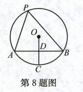 8. 如图,在⊙O中,AB为弦,OC⊥AB于点D,且OD=DC,P为⊙O上任意一点(A,B除外),连接PA,PB,若⊙O的半径为1,则S△PAB的最大值为 ( )