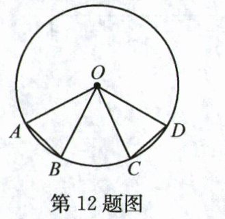 12. 在⊙O中有两个三角形:△AOB和△COD,点A,B,C,D依次在⊙O上,如图所示. 若这两个三角形关于过点O的直线l成轴对称,则点B关于直线l的对称点是______.