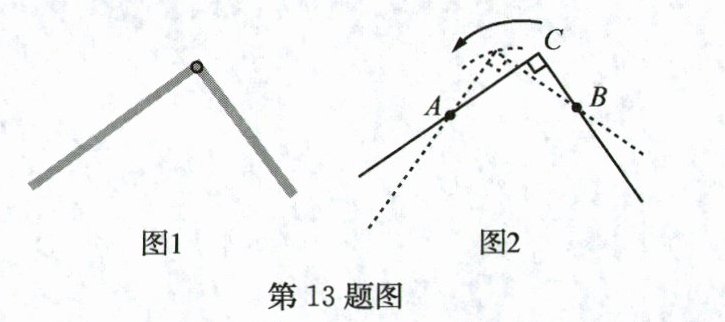 13. 我国东汉初年的数学典籍《周髀算经》中总结了对几何工具“矩”(即直角形状的曲尺,如图1所示)的使用之道,其中就有“环矩以为圆”的方法. 我国许多数学家对该方法作了如下更具体的描述:如图2所示,在平面内固定两个钉子A,B,保持“矩”的两边始终紧靠两钉子的内侧,转动“矩”,则“矩”的顶点C的运动路线将会是一个圆. 依此描述,请用你学过的一个数学概念或定理解释“环矩以为圆”这种方法的道理:______________________________.