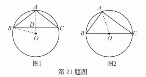 解:解x² - 8x + 15 = 0得x1 = 3,x2 = 5,当第三边长是3时,三角形三边长为3,3,4. 如图1,AB = AC = 3,BC = 4,点O为△ABC的外接圆圆心,连接OA,OB,OA交BC于点D.