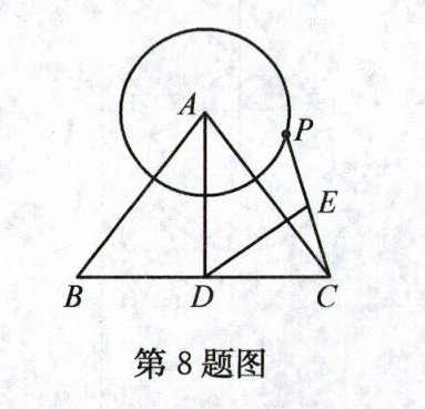 8. 如图,$\triangle ABC$ 中,$AB = AC$,$BC = 6$,$AD\perp BC$ 于点 $D$,$AD = 4$,$P$ 是半径为2的 $\odot A$ 上一动点,连接 $PC$,若 $E$ 是 $PC$ 的中点,连接 $DE$,则 $DE$ 长的最大值为( )