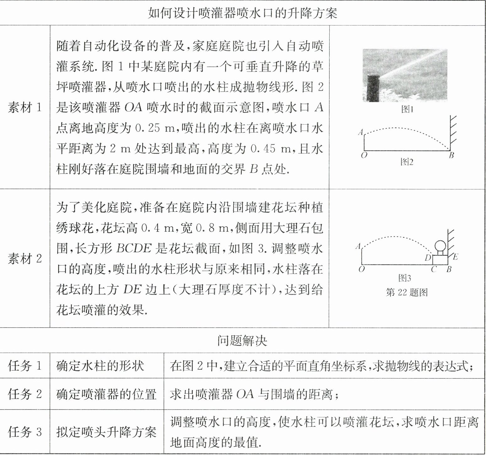 解:任务1:以点$O$为坐标原点,$OB$所在直线为$x$轴,$OA$所在直线为$y$轴建立平面直角坐标系,则顶点坐标为$(2,0.45)$。设抛物线解析式为$y = a(x - 2)^{2}+0.45$。把$A(0,0.25)$代入,得$0.25 = a(0 - 2)^{2}+0.45$,解得$a = -\frac{1}{20}$,$\therefore$抛物线的表达式为$y = -\frac{1}{20}(x - 2)^{2}+0.45$。 任务2:令$y = -\frac{1}{20}(x - 2)^{2}+0.45 = 0$,解得$x_{1}=5$,$x_{2}= - 1$(舍去),$\therefore B(5,0)$,$\therefore OB = 5$,即喷灌器$OA$与围墙的距离为$5m$。 任务3:由题意,得$CD = 0.4m$,$BC = 0.8m$,又