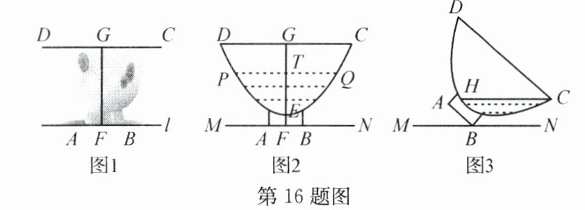16. 如图1是一个瓷碗,如图2是其截面图,碗体$DEC$呈抛物线状(碗体厚度不计),碗口宽$CD = 12$cm,此时面汤最大深度$EG = 8$cm.