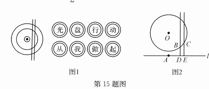 15. 如图1是某学校食堂墙壁上“光盘行动,从我做起”的矩形宣传画,画的左侧为一个圆盘上摆放一双筷子,画的下边缘为水平线,图2是其示意图,水平线l上的点A在圆心O的正下方,筷子与⊙O右下方交于B,C两点,线段BD,CE分别垂直l于点D,E. 测得AD=3DE=15 cm,CE=$\frac{3}{2}$BD=15 cm,则⊙O的半径为________cm.