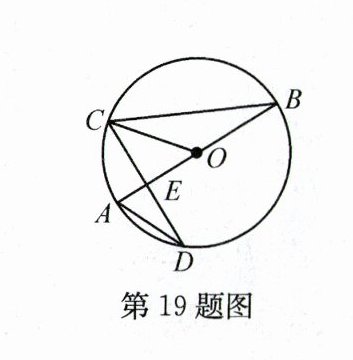 19. (8分)如图,$AB$是$\odot O$的直径,$CD$是$\odot O$的一条弦,且$CD\perp AB$于点$E$,连结$AD$,$BC$,$CO$。