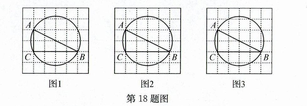 18. (6分)由小正方形构成的$6\times6$网格中,每个正方形的顶点叫做格点。$\triangle ABC$的顶点都在格点上,$\odot O$经过$A$,$B$,$C$三点,仅用无刻度的直尺在给定的网格中按要求作图(不写作法,保留作图痕迹)。