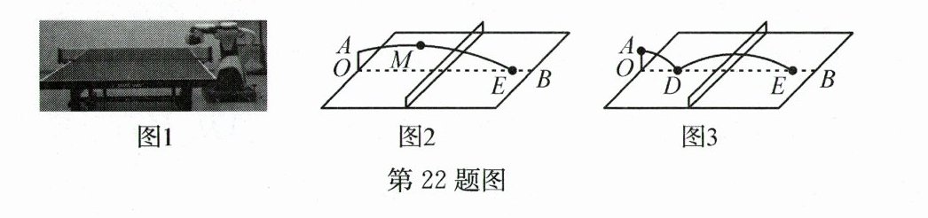 22. (10分)图1是一张带智能发球机的乒乓球桌,它可以自定义设置球的落点、速度、弧度及旋转方式,能更真实地模拟实战。图2是发球机从中线$OB$的端点$O$的正上方0.3 m处的$A$点发球,球呈抛物线在$OB$正上方飞行,当飞行的水平距离为1 m时,达到最高点$M$,其高度为0.4 m。以$O$为原点,$OB,OA$所在直线分别为$x$轴,$y$轴建立平面直角坐标系。