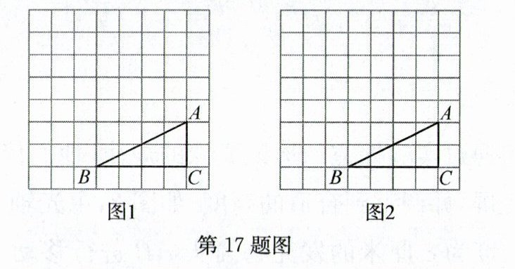 17. (6分)如图,在8×8的正方形网格中,每个小正方形的边长都为1,点$A,B,C$均在格点上,请按要求在网格中画图,所画图形的顶点均需在格点上.