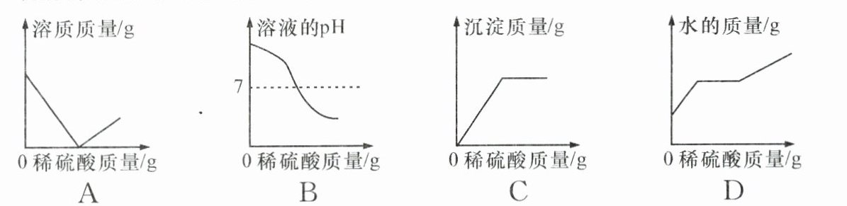 B 解析:在稀硫酸中加入Zn,反应生成硫酸锌和氢气,溶液pH逐渐变大;在稀硫酸中加入BaCl₂,反应生成硫酸钡和盐酸,溶液pH几乎不变;在稀硫酸中加入碳酸钙,反应生成硫酸钙、二氧化碳和水,溶液pH逐渐增大;在稀硫酸中加入氢氧化钠,反应生成硫酸钠和水,溶液pH逐渐增大。
