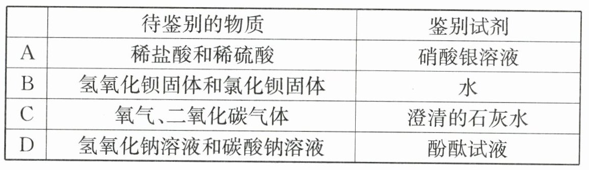 C 解析:A项氯化银和硫酸银都是白色沉淀,难以鉴别;B项氢氧化钡与氯化钡都会溶于水,难以分辨;D项氢氧化钠溶液和碳酸钠溶液都是碱性的,遇到无色酚酞都会变红,因此无法鉴别。