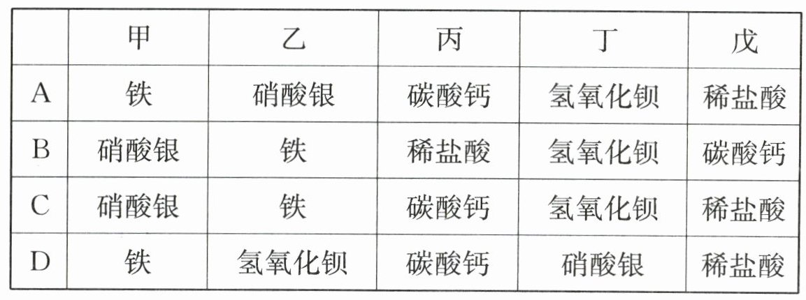 14. 如图所示,围棋棋盘上有五枚棋子,代表铁、稀盐酸、氢氧化钡、碳酸钙、硝酸银五种物质,相邻棋子间的连线表示物质间可以反应。已知与戊的反应中:甲—戊的反应类型不同于其他几个反应;丙—戊反应能产生一种气体,且该气体还能与丁反应生成沉淀。则下列对应关系正确的是( )