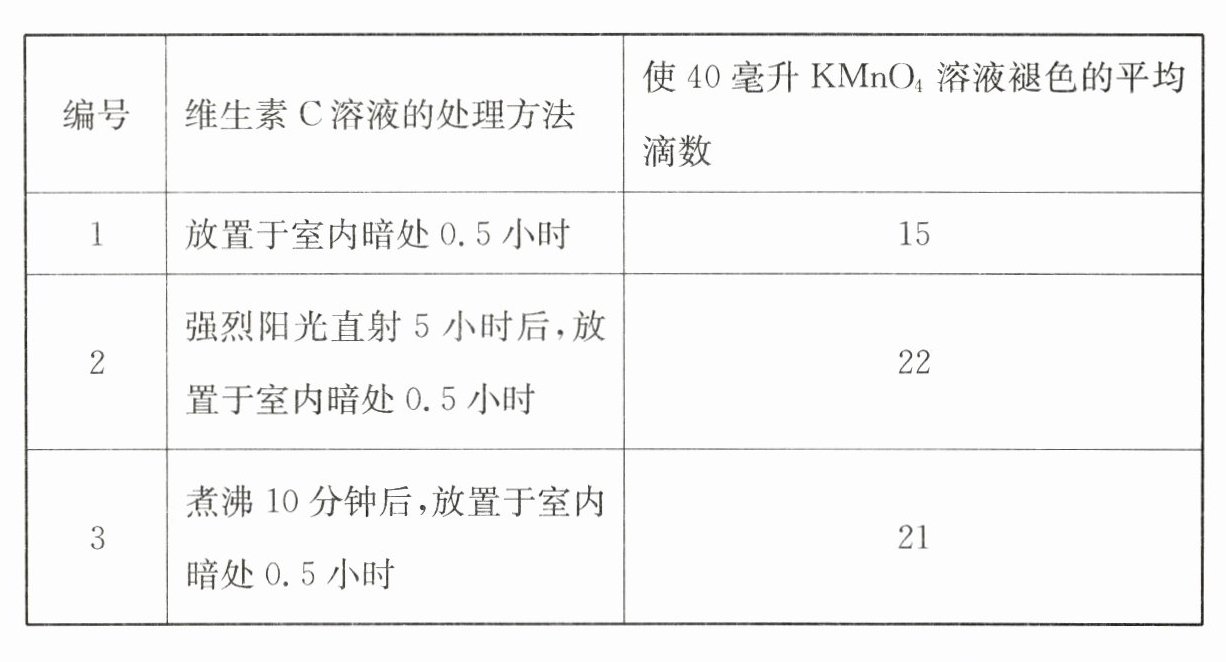 34. 为了解环境因素对维生素C含量的影响,从而更好地保存有关食物,某兴趣小组同学根据维生素C可使高锰酸钾(KMnO₄)溶液褪色的原理,进行了如下表所示的实验。