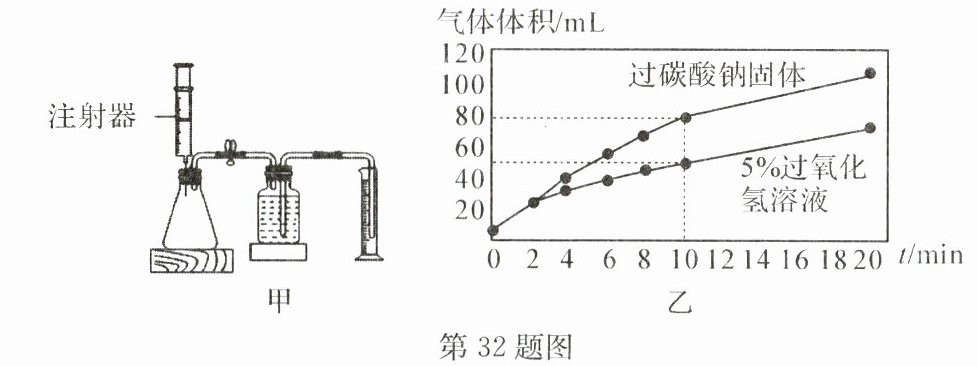 【选择制氧剂】市场上销售的化学试剂制氧机一般以过氧化氢溶液或过碳酸钠固体为主要原料。两种制氧剂哪个制氧效率更高呢? 该小组利用图甲所示装置进行实验,记录0~20分钟量筒中水的体积,得到图乙。