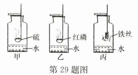 29. (5分)氧气是一种化学性质比较活泼的气体,它可以和许多物质发生化学反应。如图所示是硫粉、红磷、光亮的细铁丝在氧气中燃烧的实验装置。